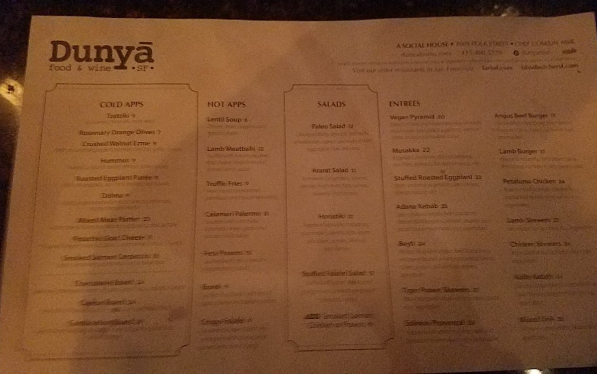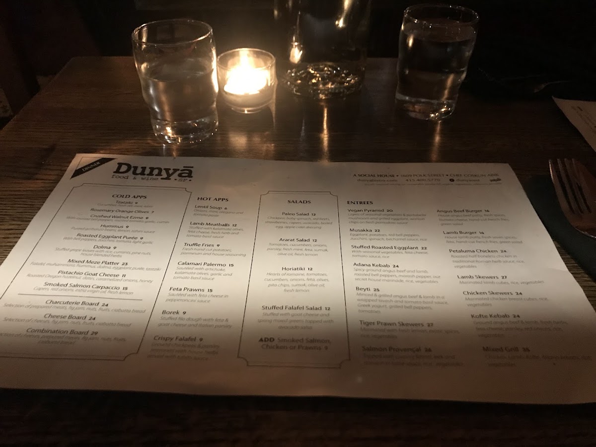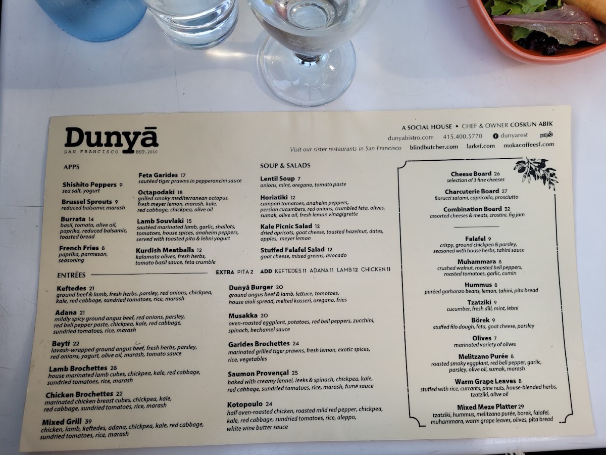 Dunyā Mediterranean Bistro & Wine Bar Menu